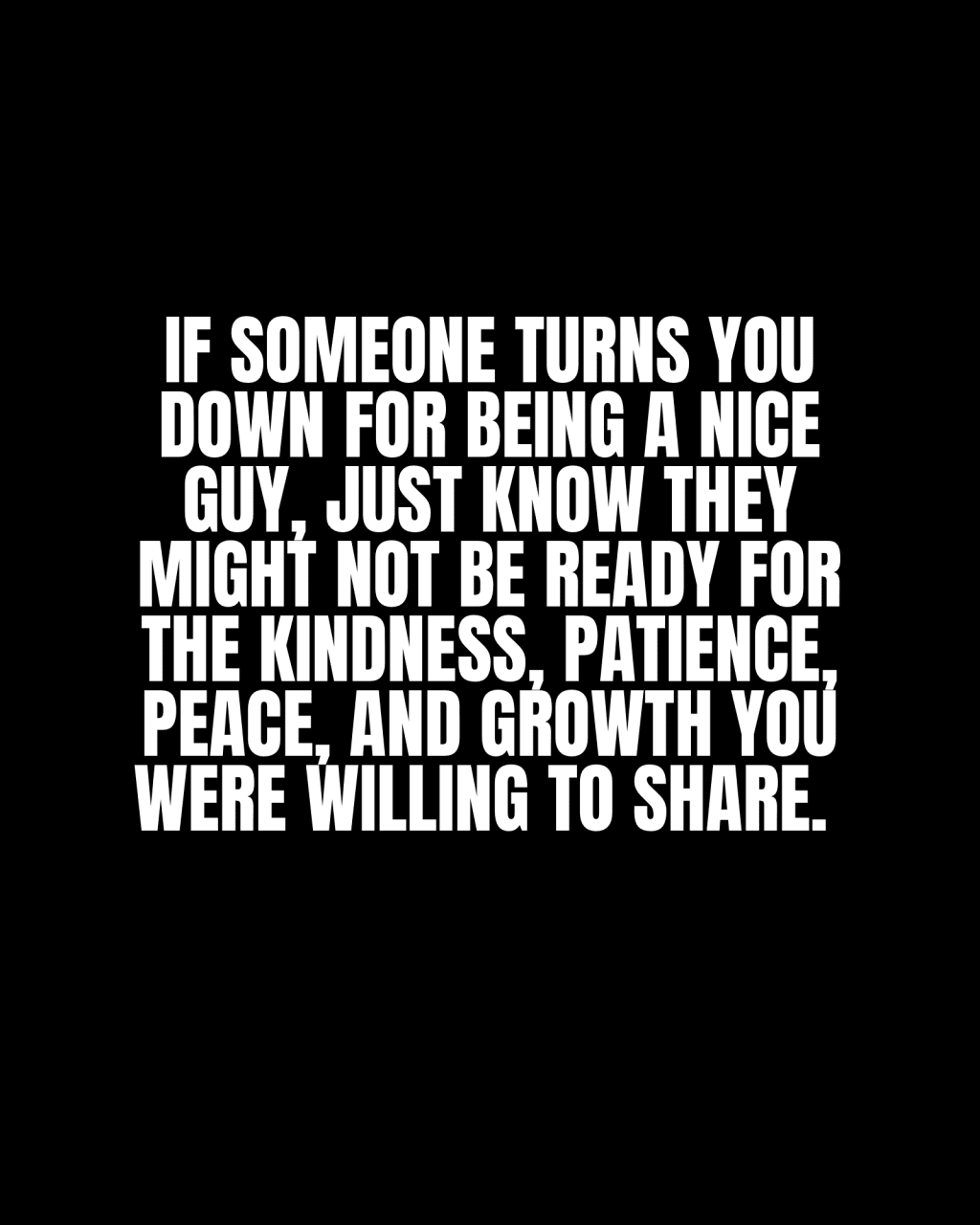 “If someone turns you down for being a nice guy, just know they might not be ready for the kindness, patience, peace, and growth you were willing to share. Congrats, you dodged a bullet! There’s someone out there who will appreciate and return the positive qualities you have to offer. It’s a reminder that the right person, who values your kindness, is waiting for you, promising a connection built on mutual understanding and appreciation.”