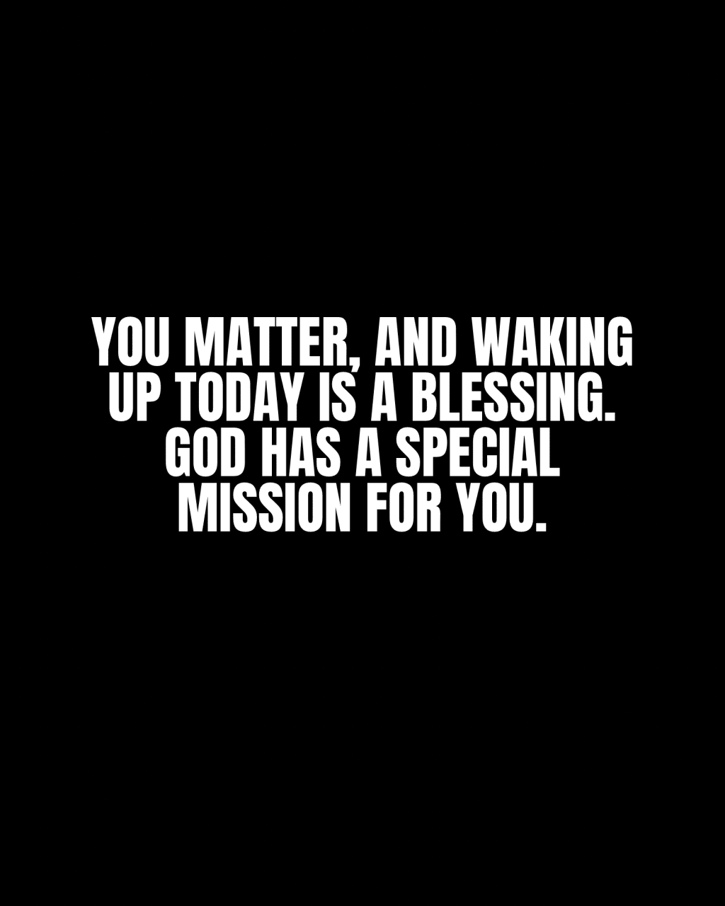 “You matter, and waking up today is a blessing. God has a special mission for you. Work hard to achieve your goals, and don’t let anyone stop you from moving forward in life. Each day is a chance to fulfill your purpose, so embrace your worth and keep going with determination.”